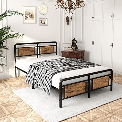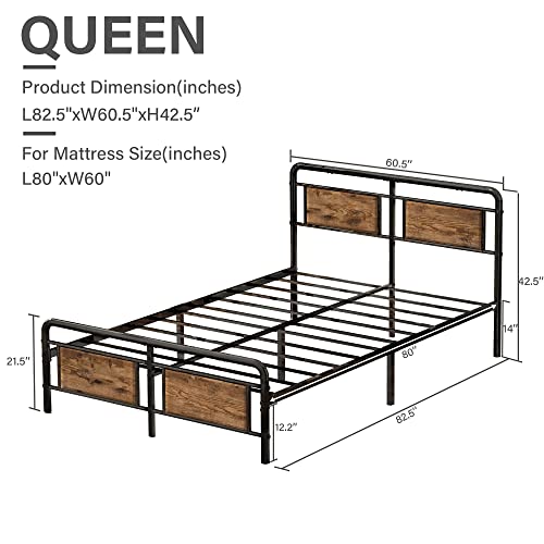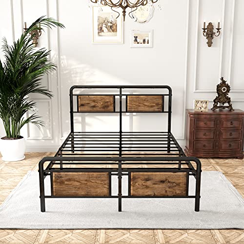 45MinST 14 Inch Classic Victorian Platform Bed Frame, with Vintage Brown Wooden Headboard and Footboard, Strong Metal Slat Support, Easy Assembly, Noise Free, Box Spring Replacement, Queen