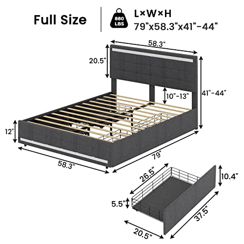ADORNEVE LED Full Size Bed Frame with Storage Drawers, Platform Bed Frame with 2 USB Ports, Upholstered Bed with LED Lights Headboard Footboard, Square Stitched Button Tufted Design, Dark Grey