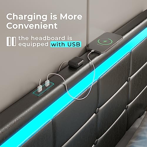 【LED Bed Frame with USB Power Strips】-The headboard has 2 USB ports, making it very convenient for you to charge your phone, tablet, headphones and other electronic, The headboard with LED lights can be controlled by remote control or mobile app with a variety of colors and light modes to choose from. Music Sync mode makes your LED lights flash to the rhythm for an immersive home concert experience.