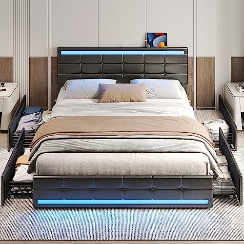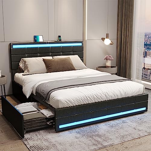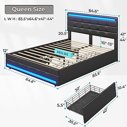 ADORNEVE Queen Bed Frame with LED Lights Leather Platform Bed with Storage Drawers and Charging Station, Upholstered LED Bed Frame Queen Size with Adjustable Headboard, No Box Spring Needed, Black