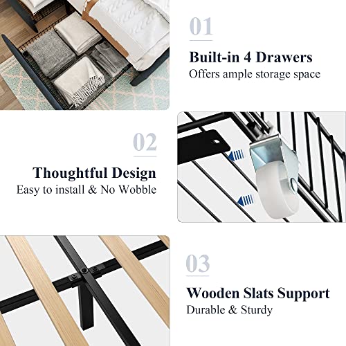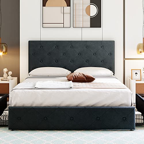 Allewie Queen Platform Bed Frame with 4 Storage Drawers & Adjustable Height Headboard, Fabric Diamond Button Tufted Design, Mattress Foundation with Wooden Slats, No Box Spring Needed, Dark Grey