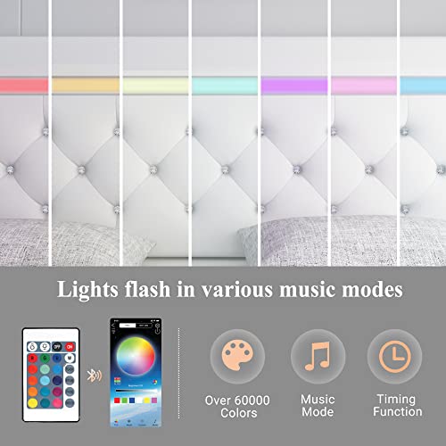 Smarter LED Bed Frame: Upholstered platform bed frame with over 60000 colors LED light. Freely adjust color, brightness, mode, timing fuction via APP or remote. Lights flash in various music modes, helding party in your bedroom.