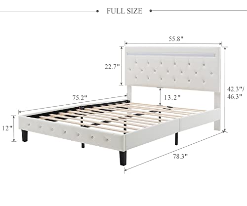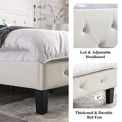 Benevika Full Size Bed Frame with LED Light Leather Platform Bed Frame with Adjustable Upholstered Headboard, Over 60000 Colors, APP Control LED Lights, No Box Spring Needed, White