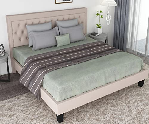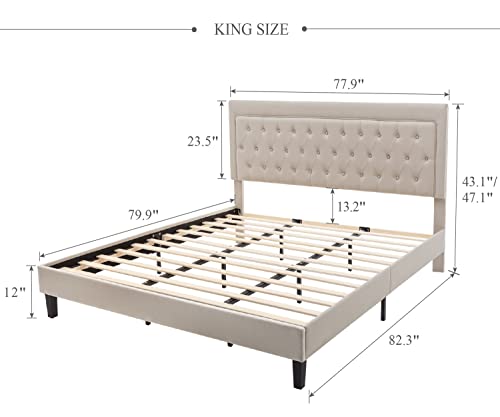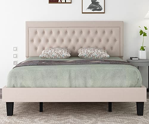 Benevika King Size Upholstered Platform Bed Frame with Linen Fabric Button Tufted Headboard, Wood Slat Support, Upholstered Mattress Foundation, No Box Spring Needed, Easy Assembly, Beige