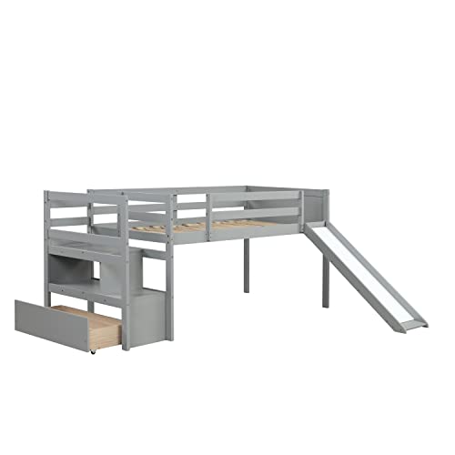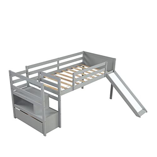 BIADNBZ Twin Size Low Loft Bed with Stairs and Slide,Solid Wood Bedframe with Drawer for Kids,Gray