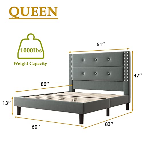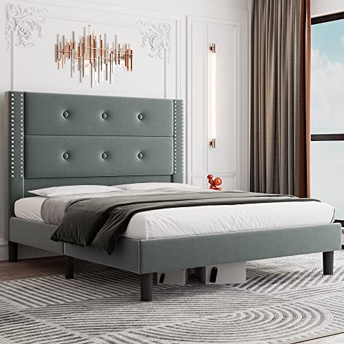 Feonase Queen Bed Frame with 32″ High Headboard, Modern Upholstered Velvet Platform Bed with Button Tufted & Nailhead Trim, Solid Wood Slats Support, No Box Spring Needed, Easy Assembly, Gray