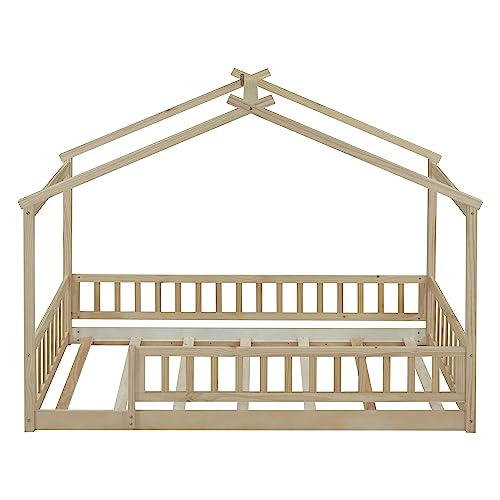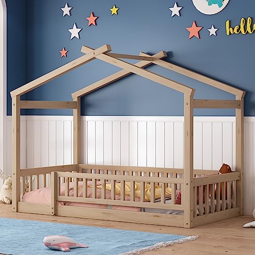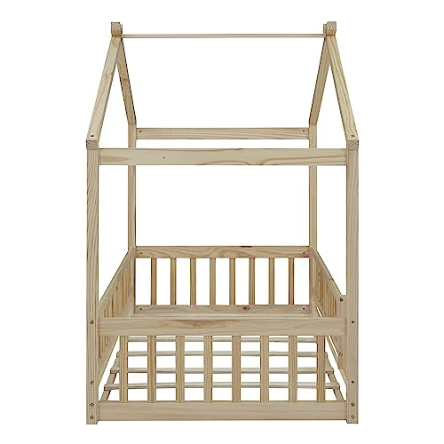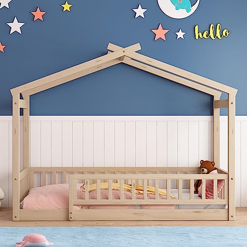 Harper & Bright Designs Twin Size Montessori Bed, Floor Bed for Kids with Fence Railing, Wood Twin Bed Frames for Kids Girls Boys,No Box Spring Needed, Natural