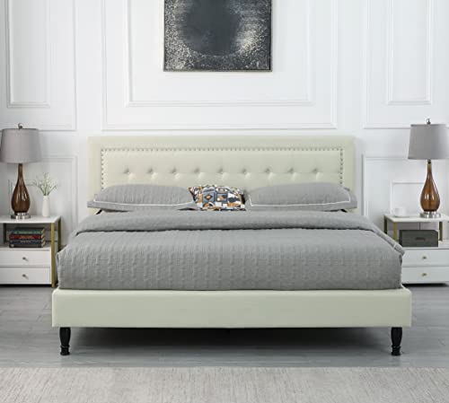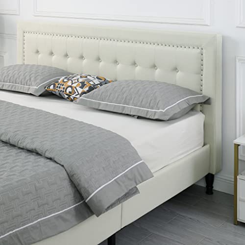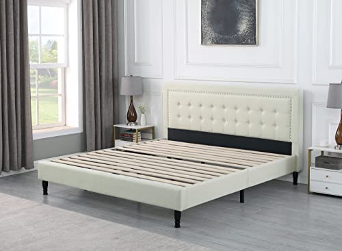 Home Life Athena II Premiere Classics Upholstered Linen Cloth Platform Bed II Button Tufted II 43.5″ Tall Headboard II Mattress Foundation II Easy Assembly II Light Beige II King furbed211_King_Beige