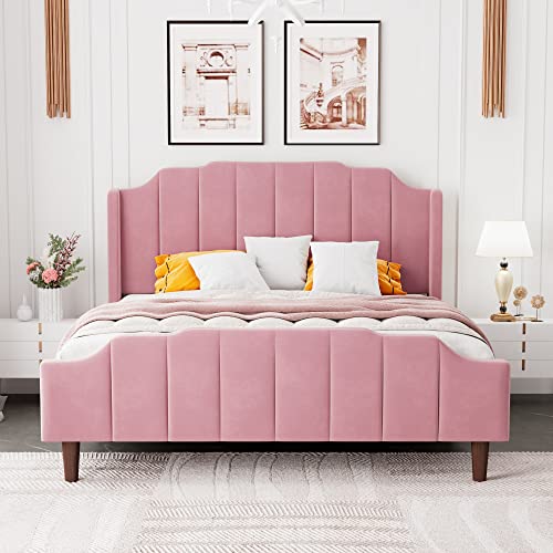 HOOMIC Queen Size Upholstered Platform Bed with Curved Velvet Wingback Headboard and Footboard,Solid Wood, No Box Spring Needed, Easy Assembly, Pink
