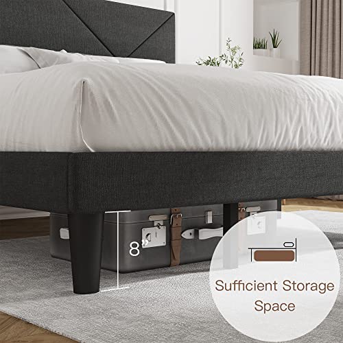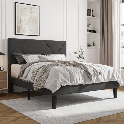 ikalido Queen Size Upholstered Platform Bed Frame with Geometric Upholstered Headboard, Strong Wood Slats Support, Mattress Foundation, Dark Grey