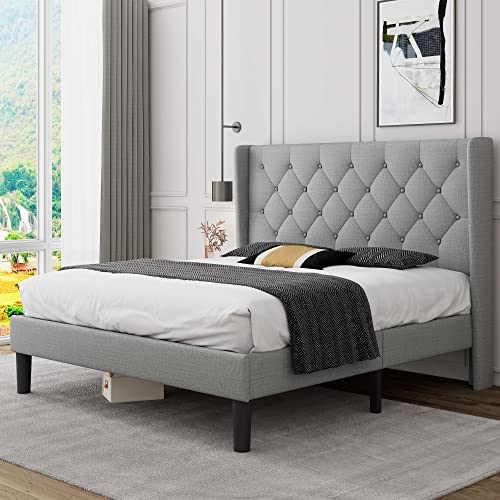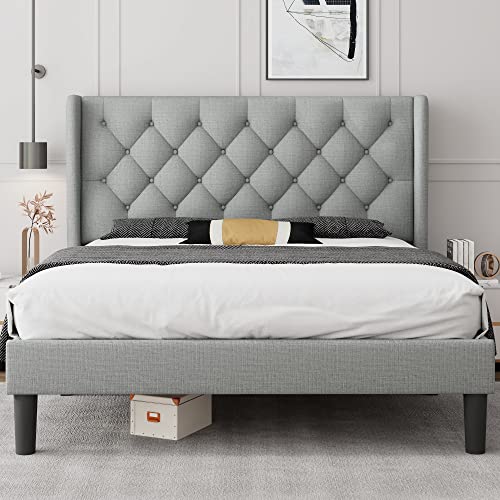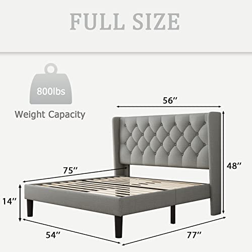 iPormis Full Size Bed Frame with Upholstered Wingback, Platform Bed Frame with Diamond Button Tufted Headboard, 8″ Under-Bed Space, Sturdy Wooden Slats, Noise-Free, No Box Spring Needed, Light Gray