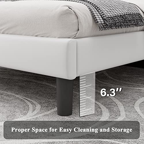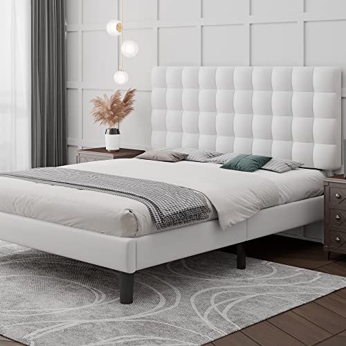 iPormis Queen Platform Bed Frame, Faux Leather Upholstered Bed Frame with Square Tufted Headboard, Wood Slats Support, No Box Spring Needed, Easy Assembly, White