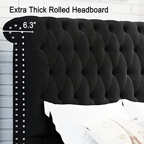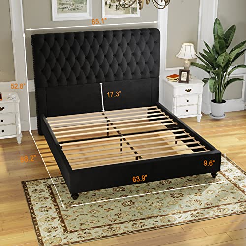 Jocisland Queen Bed Frame Upholstered Bed Sleigh Headboard Velvet Tufted Diamond Button/No Box Spring Needed/Easy Assembly/Black