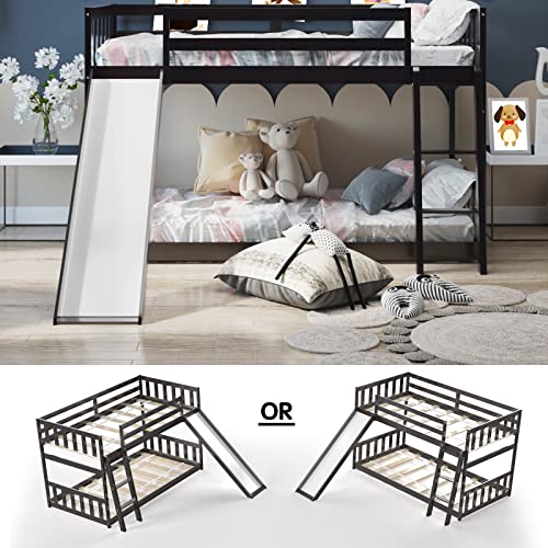 KOTEK Twin Over Twin Bunk Bed with Slide, Solid Wood Floor Bunk Bed Frame with Guardrails & Ladder, No Box Spring Needed, Kids Bedroom Furniture for Boys & Girls, Teens (Espresso)