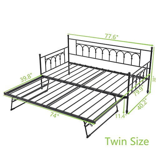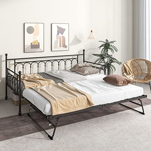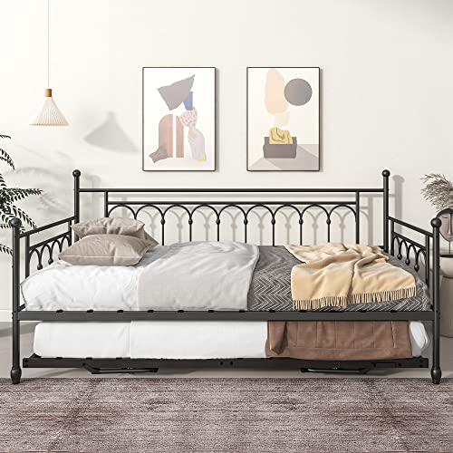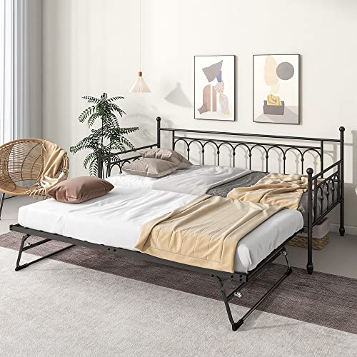 Kuurfuurdo Twin Daybed with Trundle, Metal Daybed with Pop Up Trundle, Day Bed with Trundle Bed Twin, Steel Slat Support Sofa Bed for Kids Teens Adults Living Room, Guest Room, No Box Spring Needed