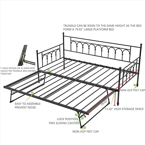 [Space-saving Metal Frame] Sofa by day, bed at night, 2-in-1 design, this set is a perfect addition to the smaller Bedroom or condo with limited space. In addition to serving as single couch, on which you can watch TV or read a book to kill the time, the set is also great as guest beds, the trundle features braces which makes it easily rise to the height of a bed, also the trundle can be coupled to daybed by one T-notch design, making this set is very convenient for overnight guests.