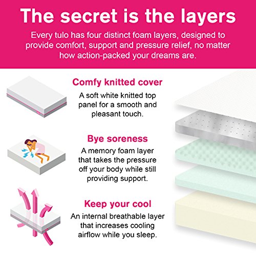 Tulips four-layers provide the optimal comfort and best night’s sleep. The knitted cover provides a Top panel with a soft and comfy touch. The memory foam mattress layer gives support and alleviates pressure. The internal breathable layer helps you keep cool while you sleep. Finally, the foundational layer is either soft, Medium, or firm depending on your choice.