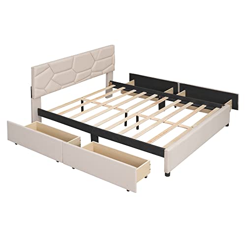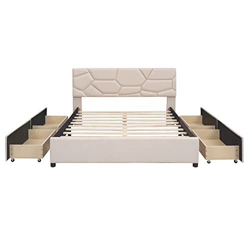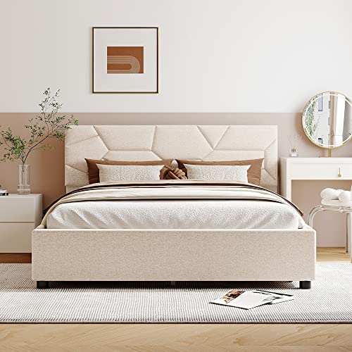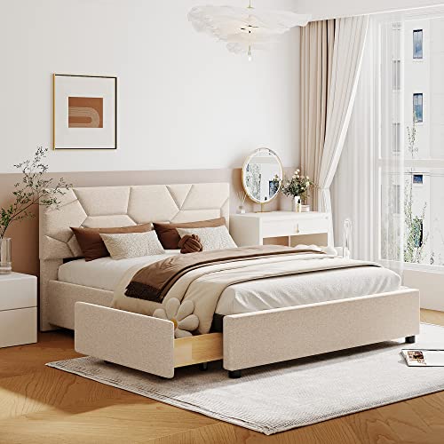 Merax Queen Size Platform Bed with 4 Drawers, Queen Upholstered Platform Bed with Brick Pattern Headboard, Linen Fabric, No Box Spring Needed, Beige