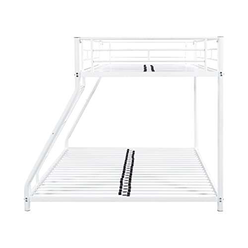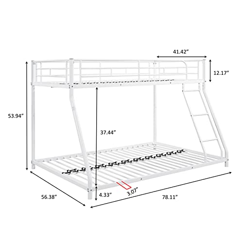 Metal Bunk Bed Frame, Twin Over Full Bunk Bed with Ladder and Full-Length Guardrail, Support Strip and Slat Locker for Teens Adults, Noise Free, White
