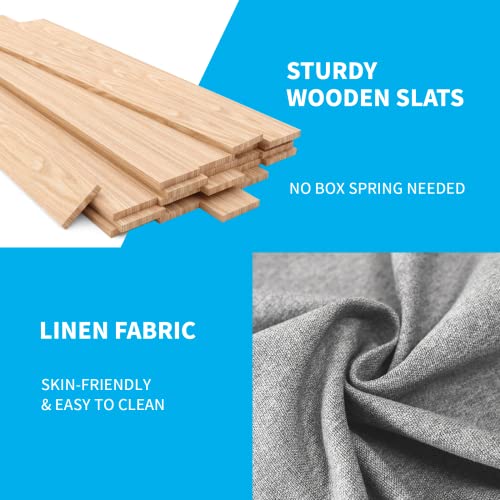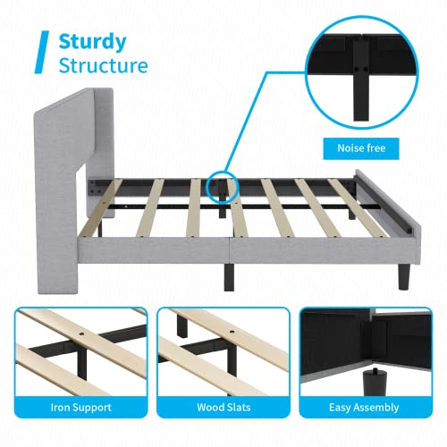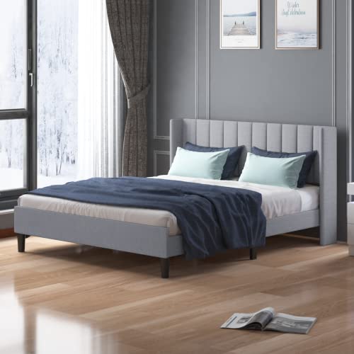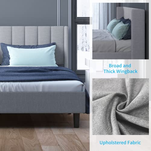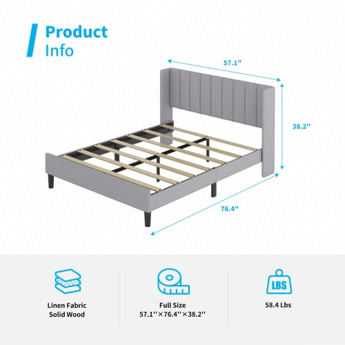 Mjkone Full Size Bed Frame with Headboard, Cotton Linen Upholstered Platform Bed Frame with Wingback Headboard Modern Bed Frame with Wood Slat Support, No Box Spring Needed, Easy Assembly, Light Grey