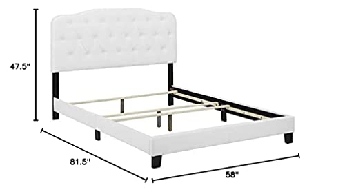 Refresh your bedroom space with the cozy elegance of the Amelia Full Bed. Designed with chic style and contemporary charm, Amelia is upholstered in smooth Vegan Leather and features a timeless button-tufted headboard, solid wood and LVL construction, and wood legs with non-marking caps. Complete with reinforced center beams for maximum stability, Amelia accommodates memory foam, spring, latex, and hybrid mattresses. A modern centerpiece to a teenager’s bedroom or guest suite, this upholstered bed frame effortlessly transforms bedroom décor with its gentle curves and luxe look. Box spring required (not included). Bed Weight Capacity: 800 lbs.