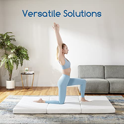 Versatile Uses: Folding Mattress Portable makes it perfect for camping, yoga, sofa bed, spare bed, guest bed, dorm room, RV mattresses, and more. Tuck away easily after uses. The versatility of the foldable bed decides that you can use as floor bed on the floor, slatted base, foundation, or adjustable base. Dimensions Reference: TWIN-38”x75”,TWIN XL-39”x80”, FULL-54”x75”, QUEEN-60”x80”