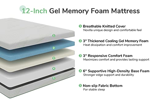 Novilla King Mattress, 12 Inch Gel Memory Foam Mattress Cooling, King Size Mattress in a Box for Back Pain Relief, Medium Firm Mattress with Edge Support & Motion Isolation