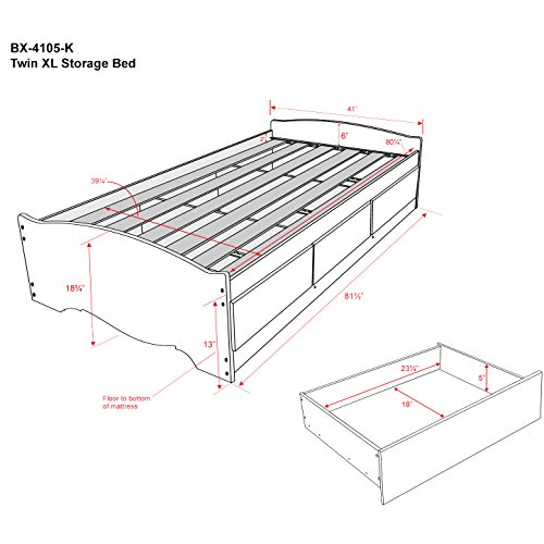 This Twin XL Storage Bed is 5 inches longer than a standard twin making it ideal for teenagers and College students. Underneath are 3 large storage drawers (20” depth) that run on smooth running metal drawer glides. Every room needs more storage and this is a great place to add it! Wood slats positioned lengthwise distribute body weight evenly and take the place of a box-spring, so the bed needs only a mattress. Three Drawers are located on one side so that the bed can be positioned left or right to suit any bedroom layout. Coordinate with other Prepac espresso furniture from our Manhattan or Regency collections. Available in two colors: Espresso finish, an attractive laminate that simulates a rich, dark wood finish or Midnight Black laminate. Please specify when ordering. This product is made from composite woods with overlay laminate and plywood slats. It ships flat-packed (in two cartons) and assembly is required. Detailed and easy-to-follow instructions are included.