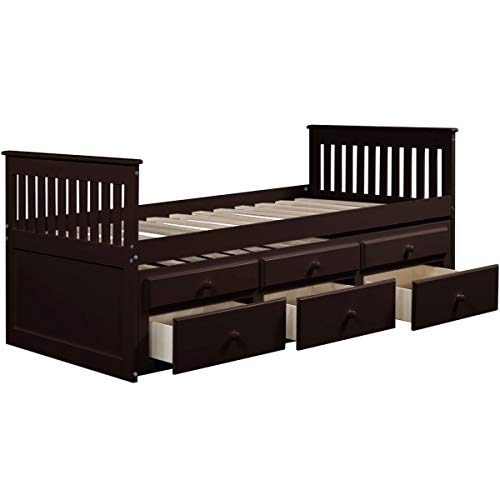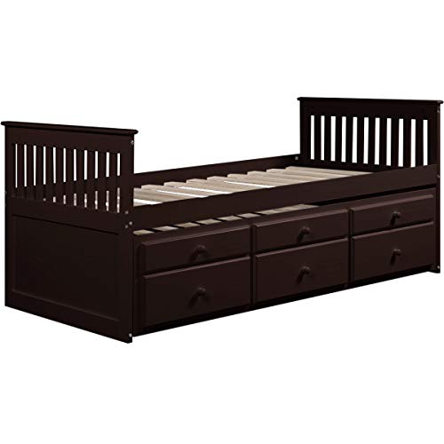 Perfect for your child’s bedroom, this twin size bed has the classic slats and sleek mouldings of mission design. This piece is made of solid pine wood with an easy-to-match walnut or white finish. The under bed trundle pulls out smoothly to show a second twin sized bed, complete with drawers for storing bedding, toys, clothes, and more.