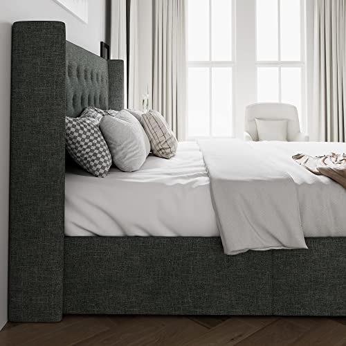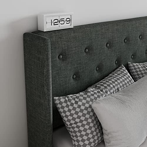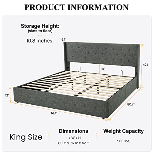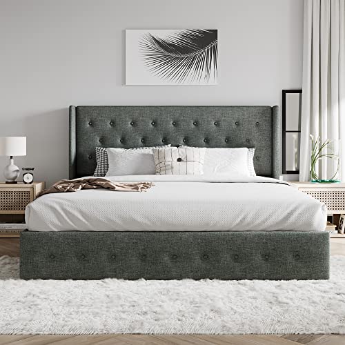 SHA CERLIN King Size Lift Up Storage Bed/Button Tufted Wingback Headboard/Hydraulic Storage/Upholstered Platform Bed Frame/No Box Spring Needed/Wood Slats Support/Dark Grey