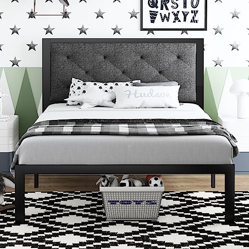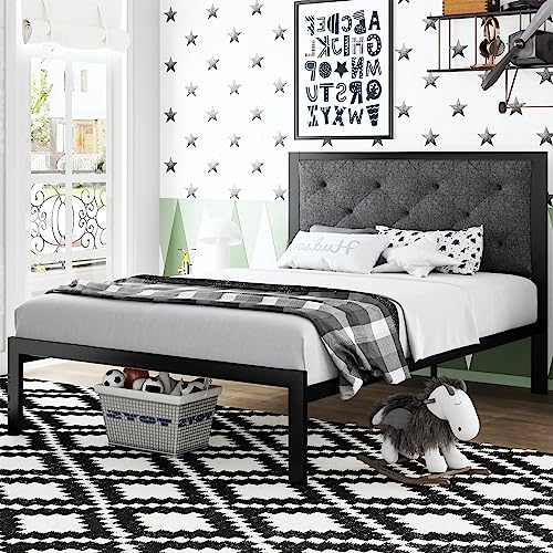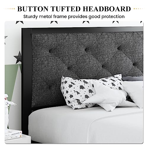 SHA CERLIN Twin Size Metal Platform Bed Frame with Fabric Upholstered Button Tufted Headboard, Mattress Foundation with 17 Strong Metal Slats Support, No Box Spring Needed, Easy Assembly, Dark Grey