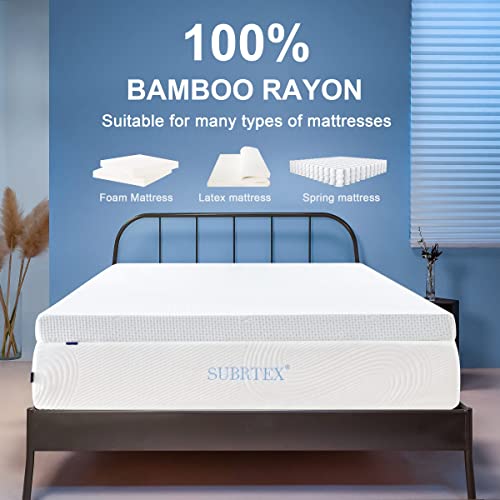 subrtex 4 Inch Mattress Topper Cover Mattress Protector Bedding Bamboo Rayon Removable Mattress Encasement for Latex Cool Mattress Cover with Zipper with Adjustable Straps (Queen,White)