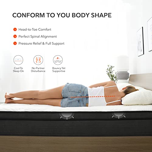 Comfort & undisturbed night’s sleep- Individually wrapped coils Encased in separate pockets are more taller, they move independently well, reduce the sensation of movement, provide the targeted support to your body, proper back support & alignment. This hybrid mattress Made with Euro pillow top design, Gel Memory Foam layer for slowly adjusts to body weight & temperature, it provide a buffer so you never feel the coils for optimal comfort. More comfortable and more plush on this queen mattress