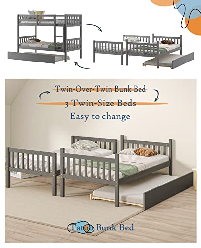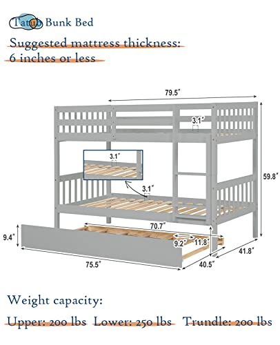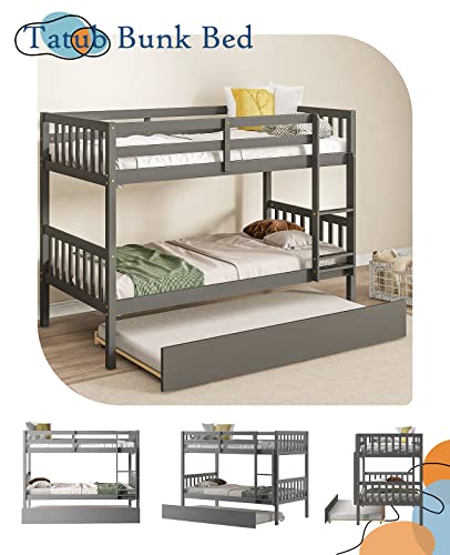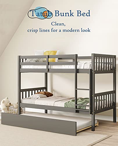 Tatub Twin Over Twin Bunk Bed with Trundle, Pine Wood Frame, Ladder and Guard Rails, Solid Bunk Bed with Trundle for Kids, Teens, Boys and Girls, No Box Spring Needed, Grey