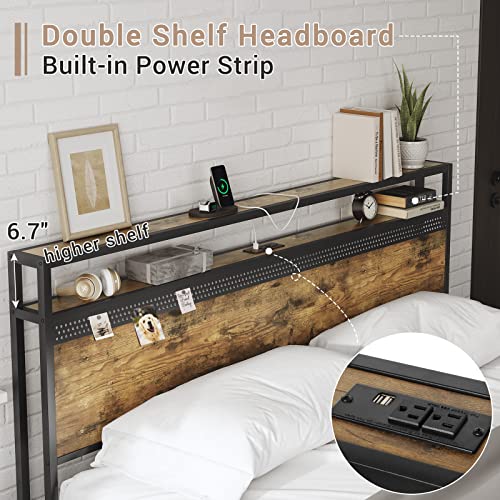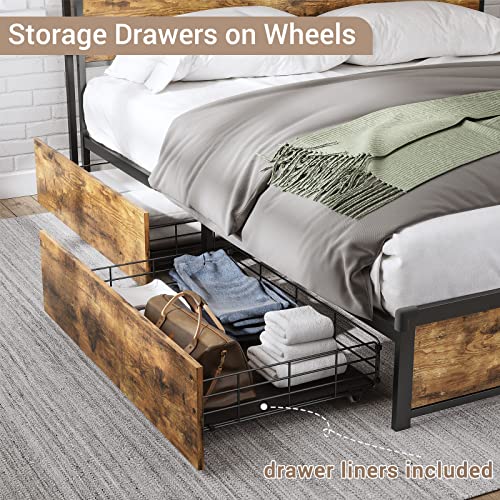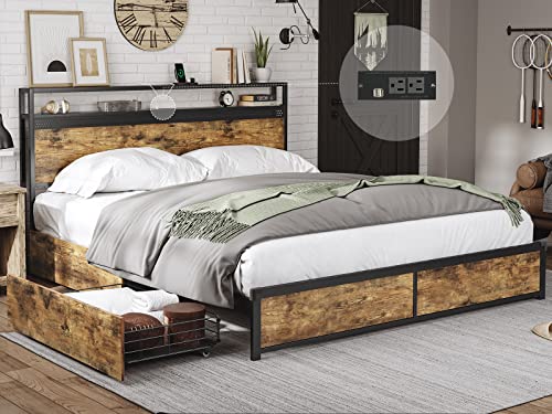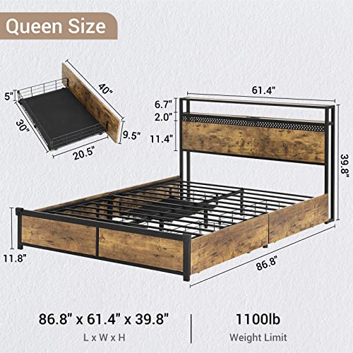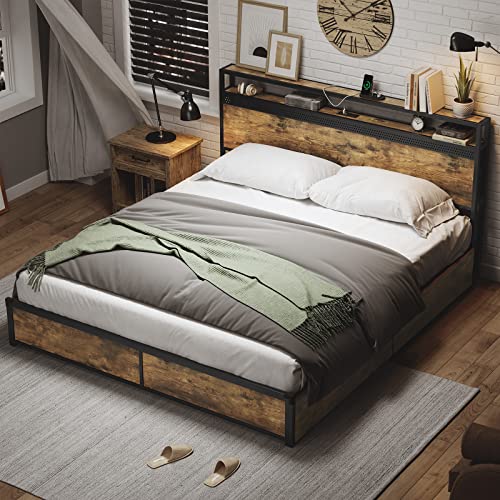 Tiptiper Queen Size Bed Frame with 4 Storage Drawers and Headboard Shelf, Industrial Metal Platform Bed with 2 Charging Outlets and 2 USB Ports, No Box Spring Needed, No Squeak, Rustic Brown