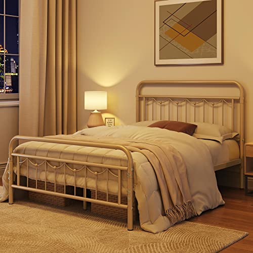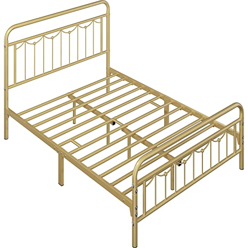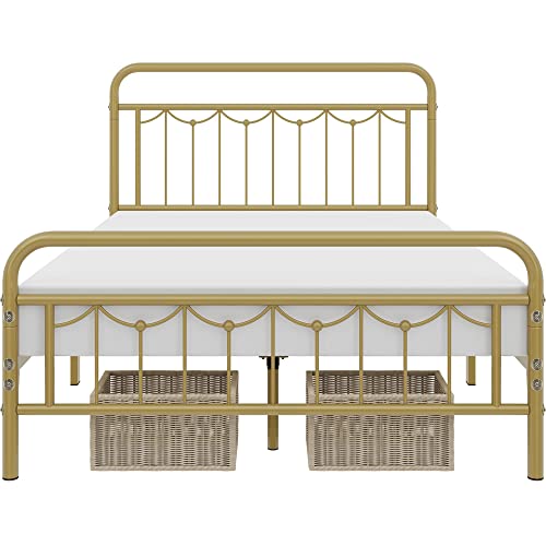 Topeakmart Full Metal Bed Frame with Vintage Headboard and Footboard, 13 Inch Heavy-Duty Metal Bed Frame with Storage,Sturdy Metal Slats, No Box Spring Needed, Antique Gold