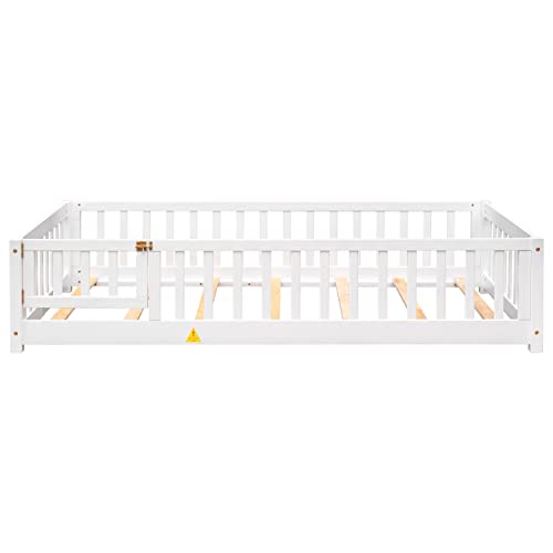 Twin Size Floor Platform Bed with Fence, Wooden Playpen Bed for Kids, Kids Fence Bed with Door, No Box Spring Needed (White)