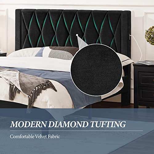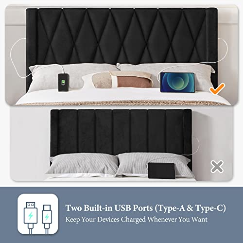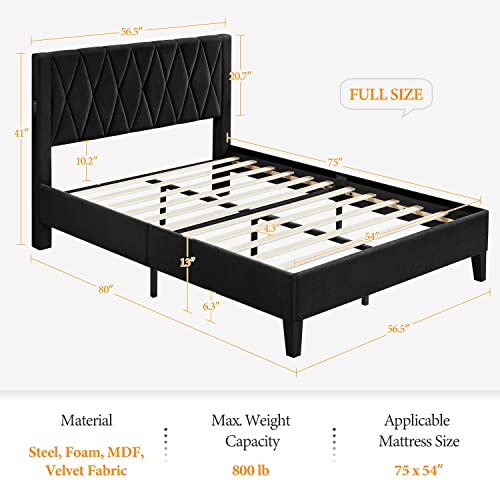 Yaheetech Full Size Upholstered Bed Frame with Headboard and 2 USB Charging Stations/Ports for Type A & Type C, Velvet Platform Bed Frame with Mattress Foundation and Wood Slat Support, Black