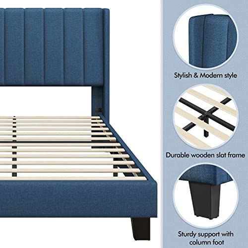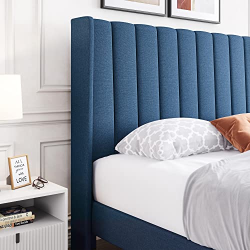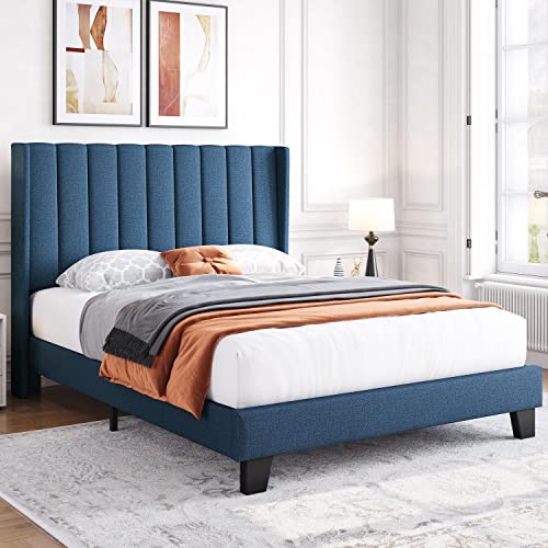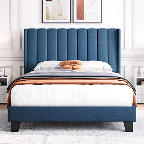 Yaheetech Full Size Upholstered Platform Bed with Wing Edge Channel Tufted Headboard/Mattress Foundation/Wood Slat Support/No Box Spring Needed/Easy Assembly, Navy Blue
