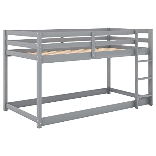 ZJIAH Solid Wood Twin Over Twin Floor Bunk Bed w Ladder, Safety Guard Rails, 400LBS Wooden Twin Bunk Beds for Teens/Adults, Low Bed Frame Bedroom Furniture, No Box Spring Required, Grey